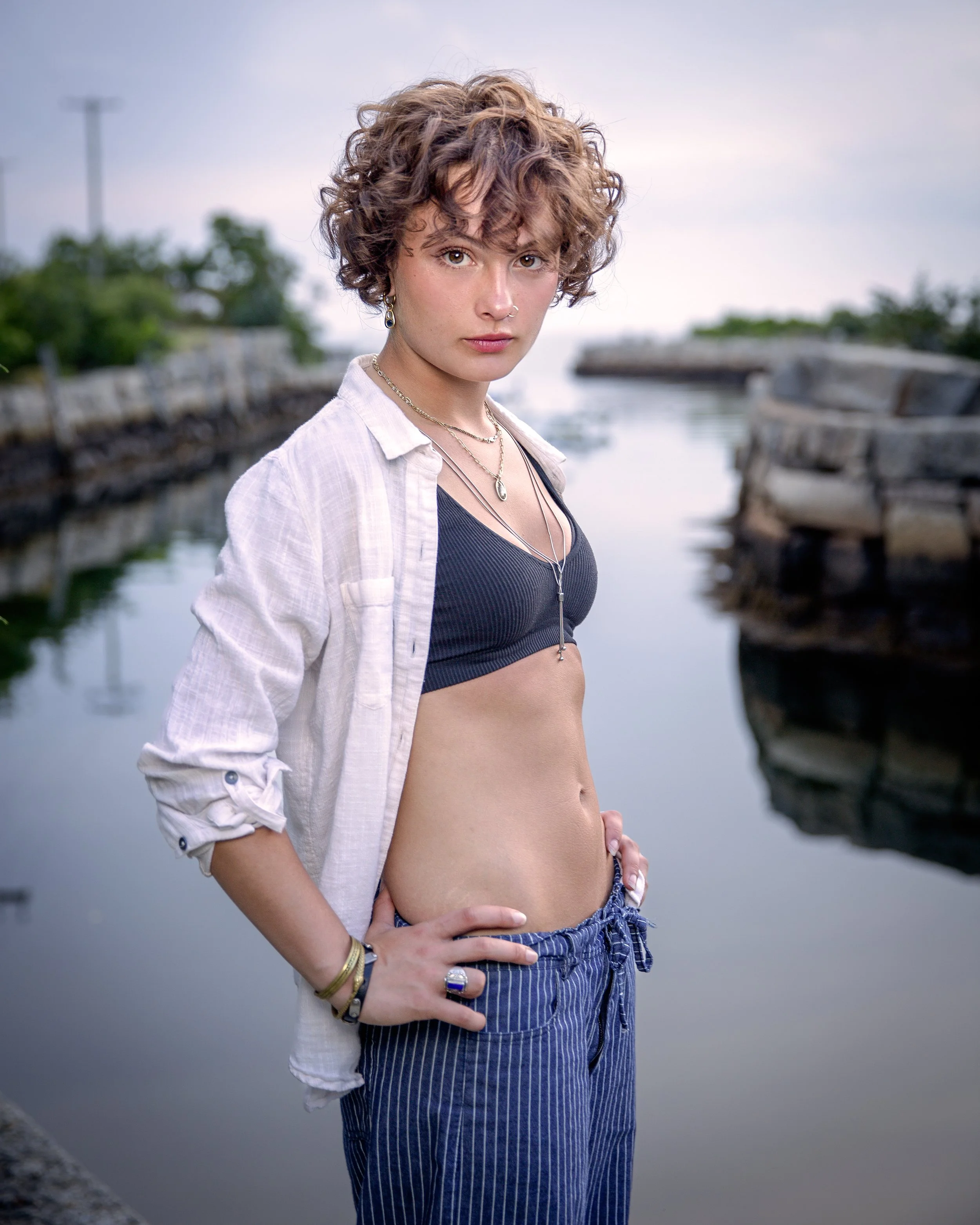 A person with short, curly brown hair stands confidently by a calm stone-lined canal, wearing a white shirt, black crop top, striped pants, and jewelry, with greenery and a cloudy sky in the background. View fullsize