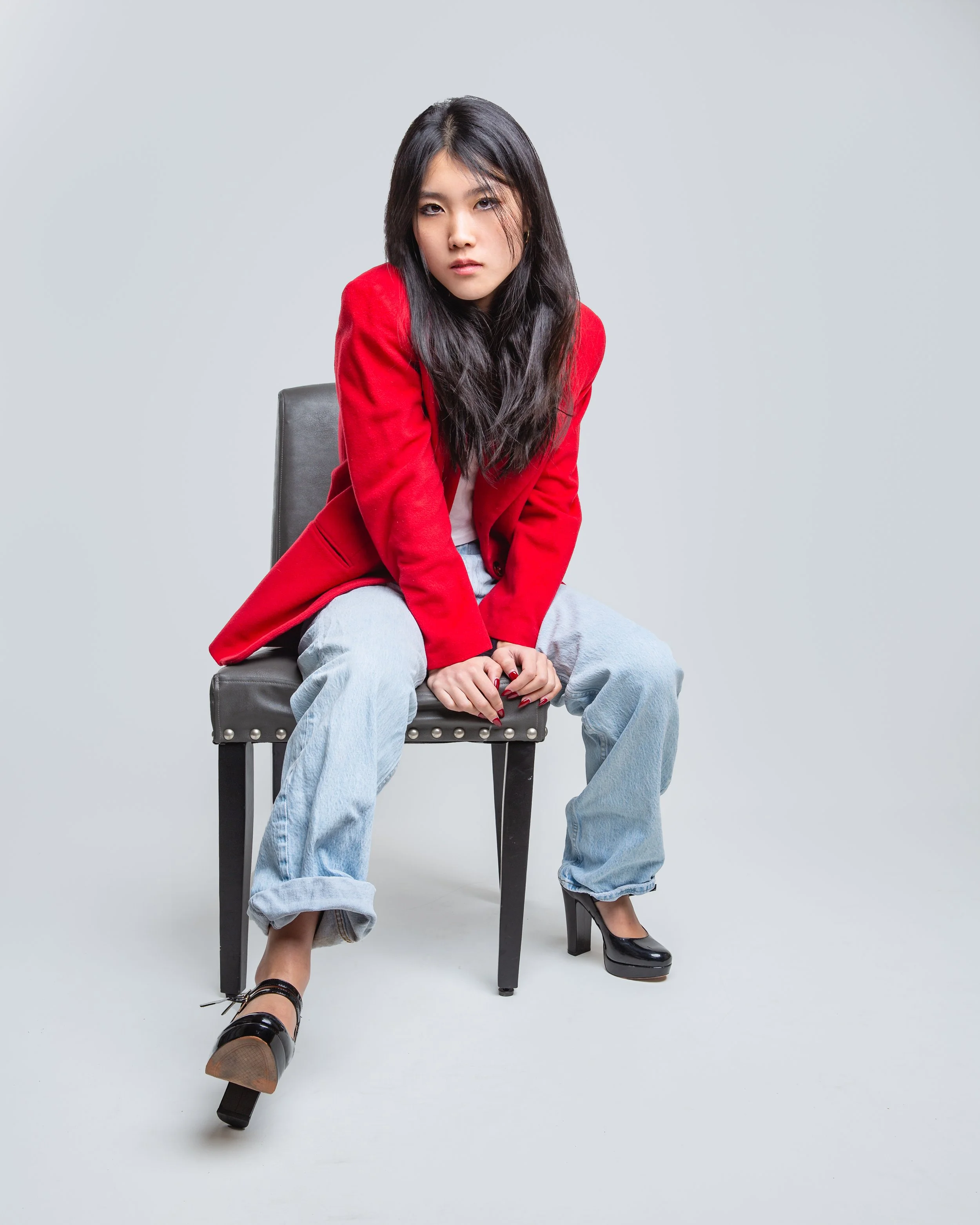 A young woman with long dark hair sits on a black chair, leaning slightly forward. She wears a bright red blazer, white shirt, light blue cuffed jeans, and black high-heeled shoes against a plain gray background.