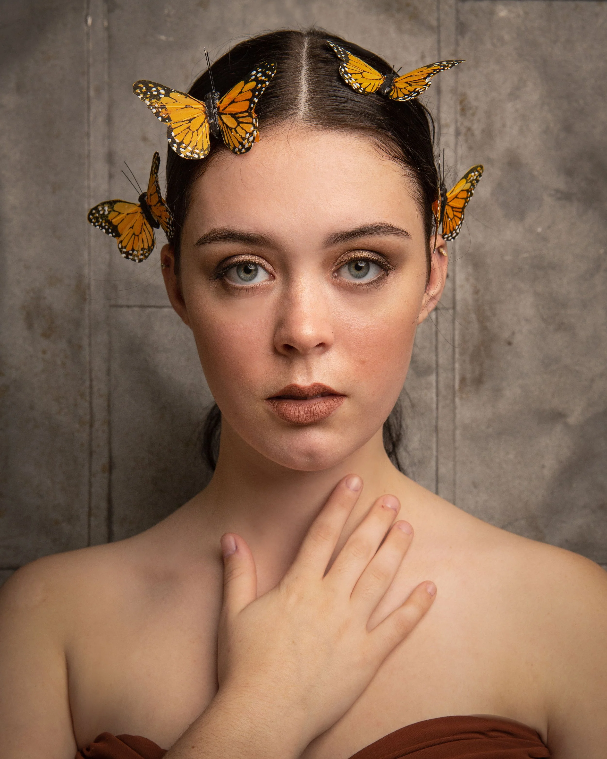 A young woman with light skin and blue eyes poses against a gray background, gazing into the camera. Monarch butterflies rest on her hair, and she places one hand gently on her chest. View fullsize
