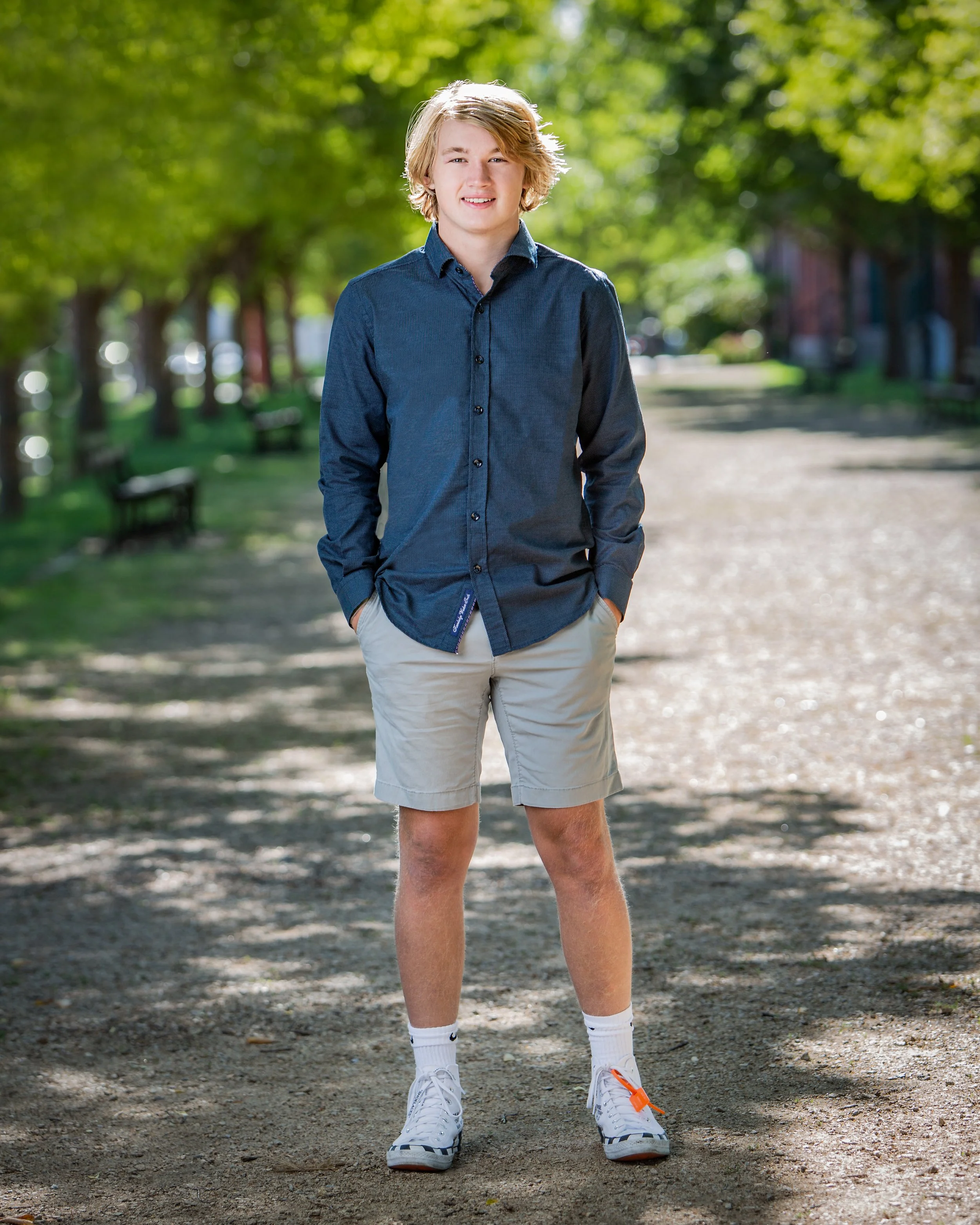 A teenage boy stands on a sunlit tree-lined path, wearing a dark button-up shirt, light khaki shorts, white socks, and sneakers. He has blonde hair and smiles with his hands in his pockets. Benches and greenery are in the background. View fullsize