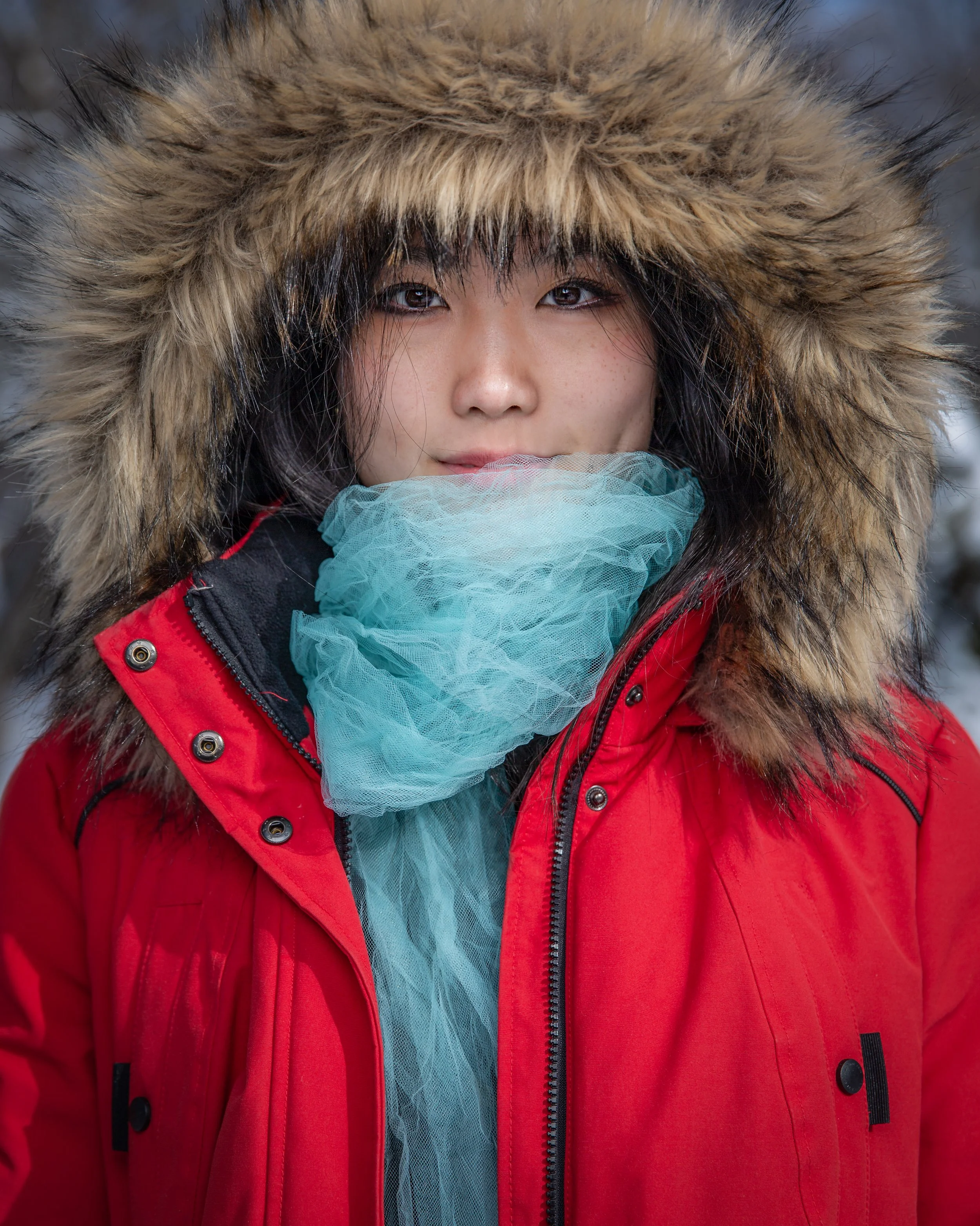 A person wearing a red winter coat with a fur-lined hood and a light blue scarf stands outdoors in snowy weather, looking directly at the camera. View fullsize
