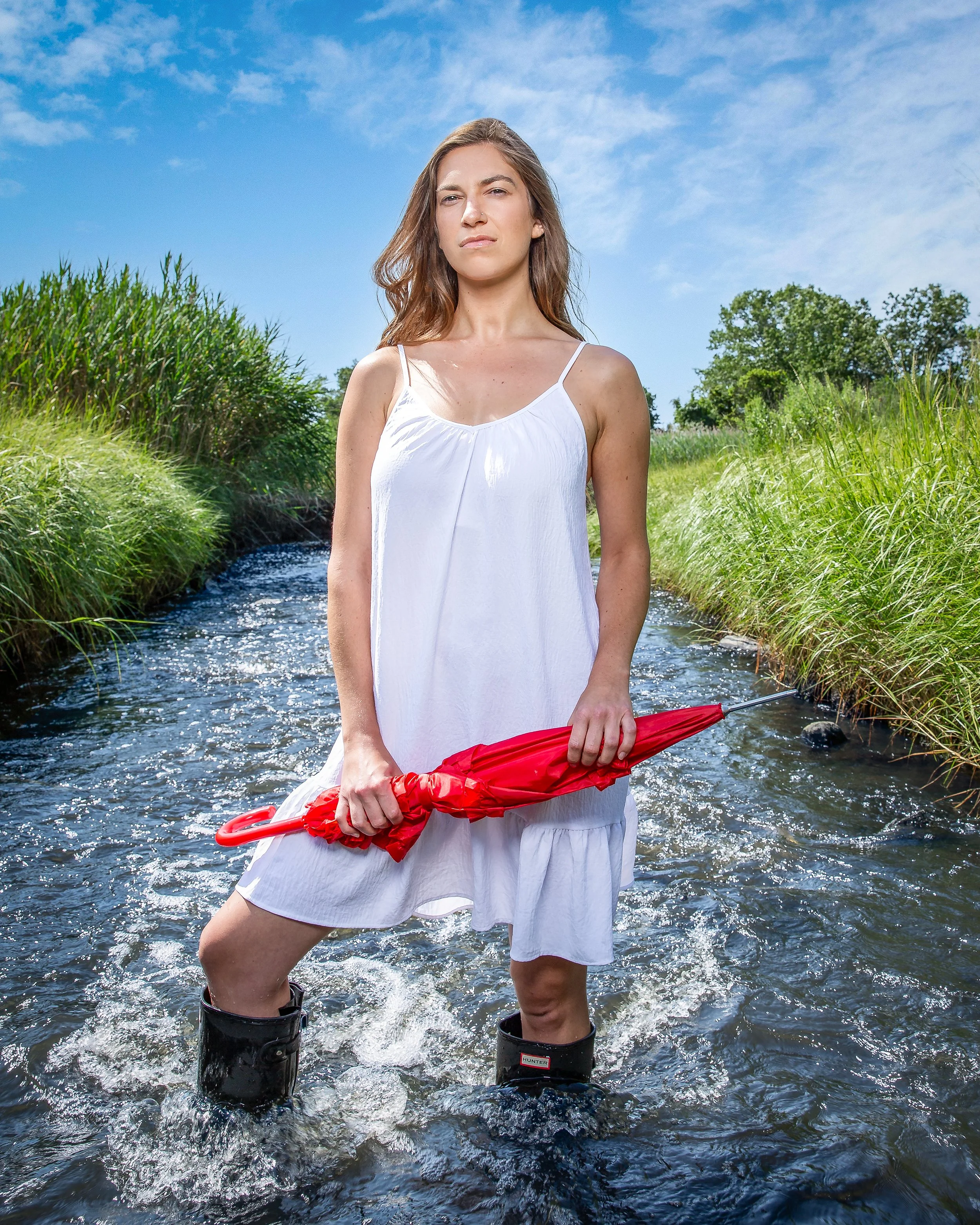 A woman in a white dress and black boots stands confidently in a shallow stream, holding a closed red umbrella. Tall green grass and a bright blue sky with scattered clouds are in the background. View fullsize