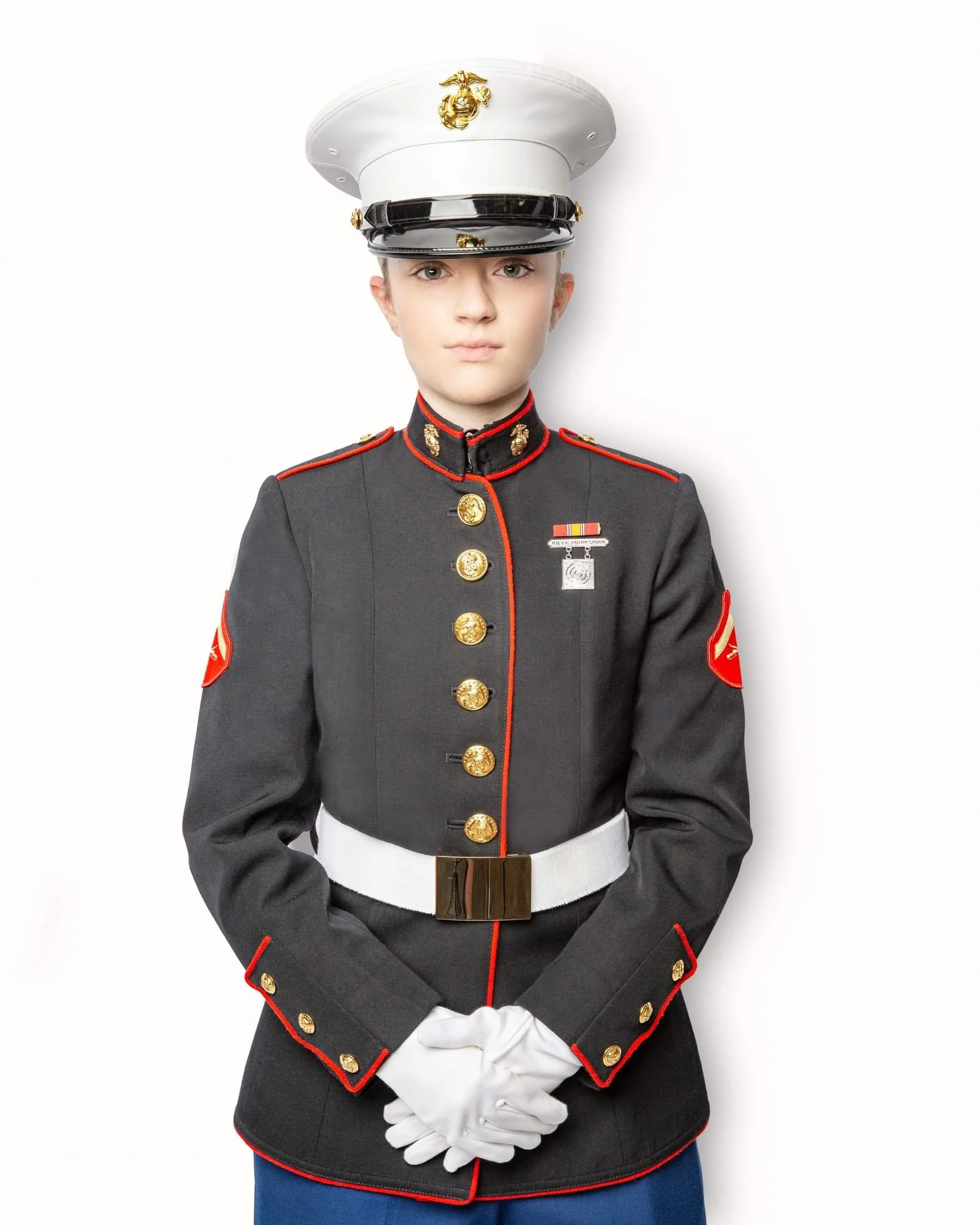 A person in a formal U.S. Marine Corps dress uniform stands against a white background, facing forward with hands clasped. The uniform includes a white hat, dark coat with red trim, white belt, and white gloves. View fullsize
