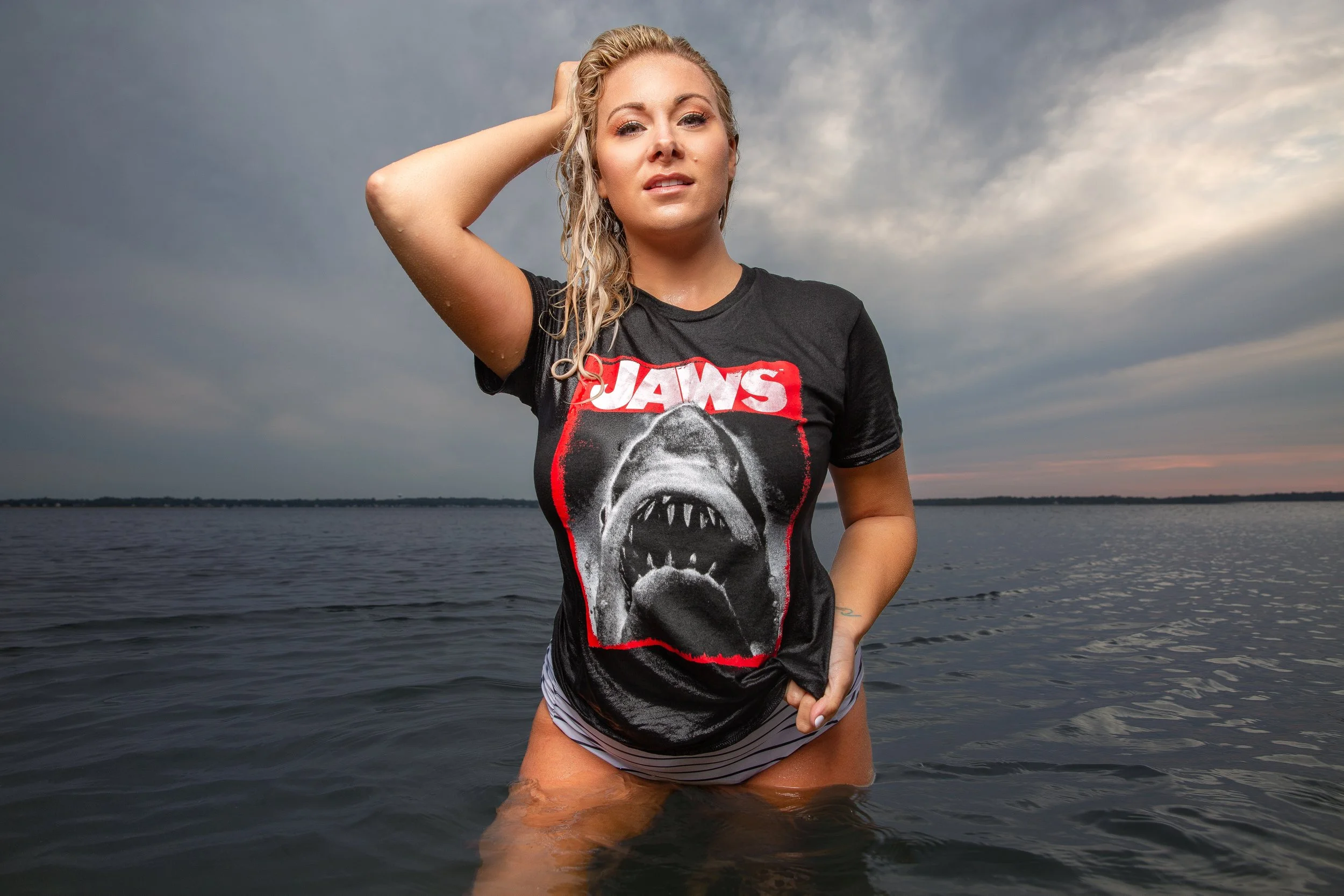 A woman stands waist-deep in water, wearing a black "Jaws" t-shirt with a large shark graphic. She has wet, blonde hair, one hand on her head, and looks confidently at the camera under a cloudy sky.