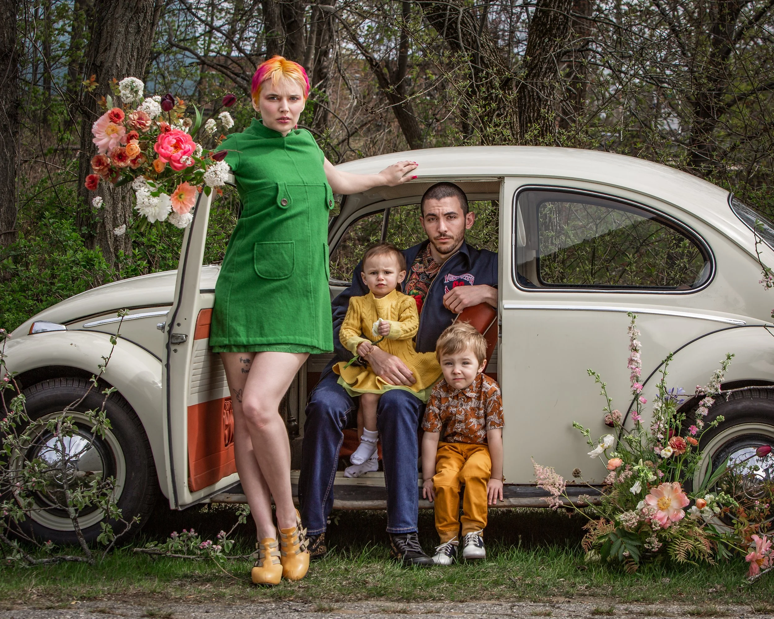A family poses by a vintage white car decorated with flowers. A woman in a green dress holds a bouquet, a man sits in the car holding a small child, and another child sits on the car's edge, all surrounded by greenery.