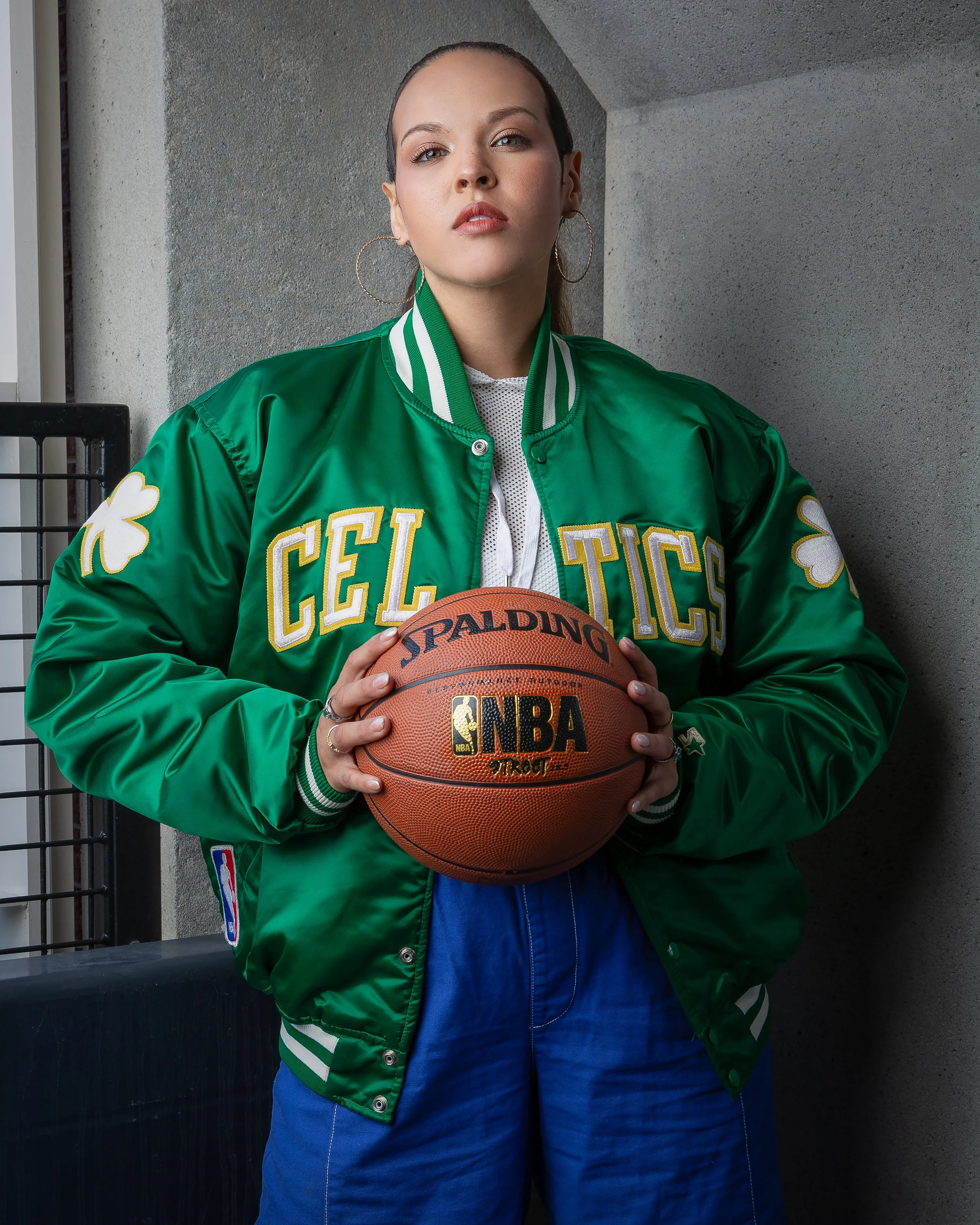A person wearing a green Boston Celtics jacket and blue pants holds a Spalding NBA basketball, standing against a concrete wall and looking confidently at the camera.