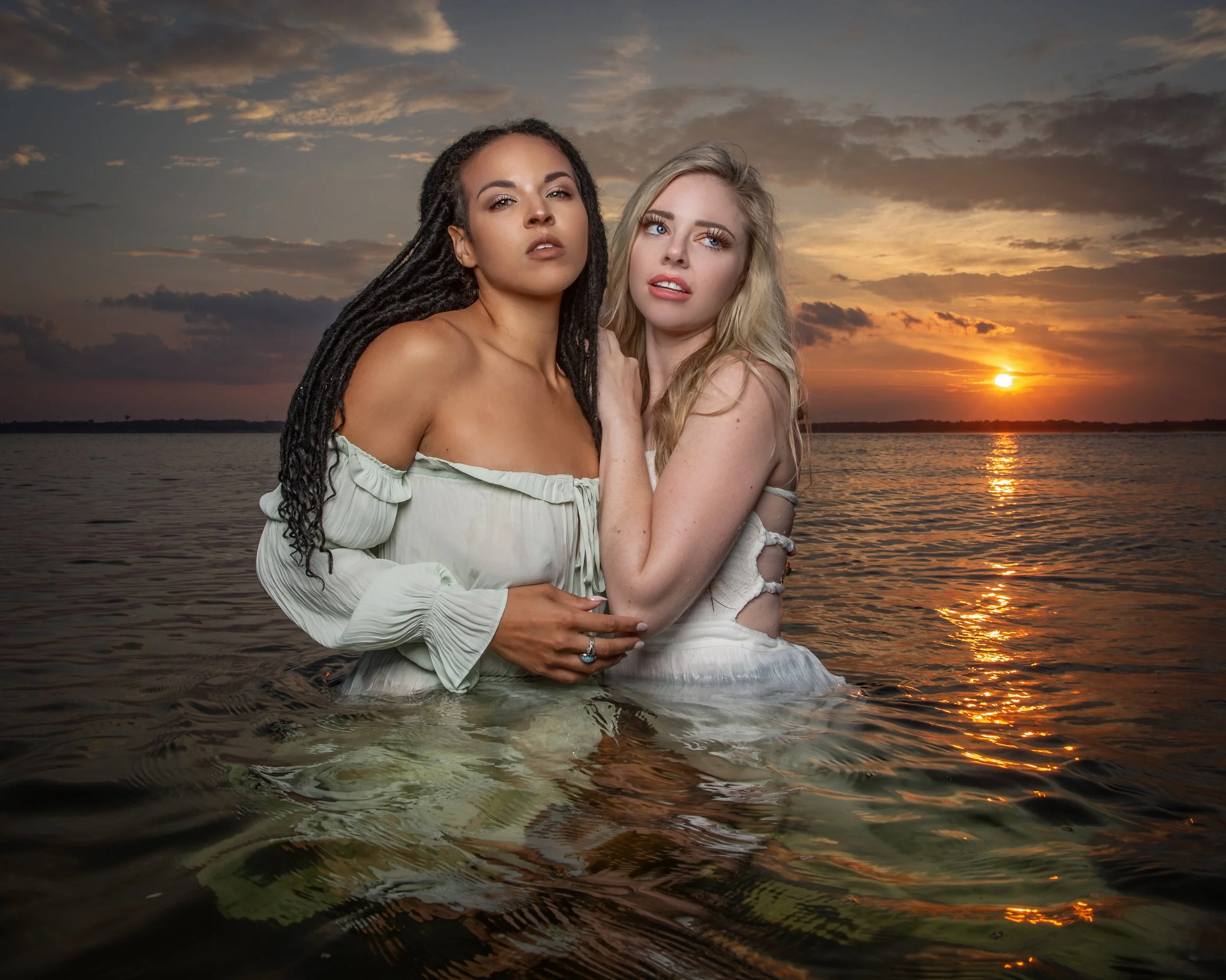Two women in white dresses stand close together in waist-deep water at sunset, with the orange sun and colorful sky reflecting on the water behind them.