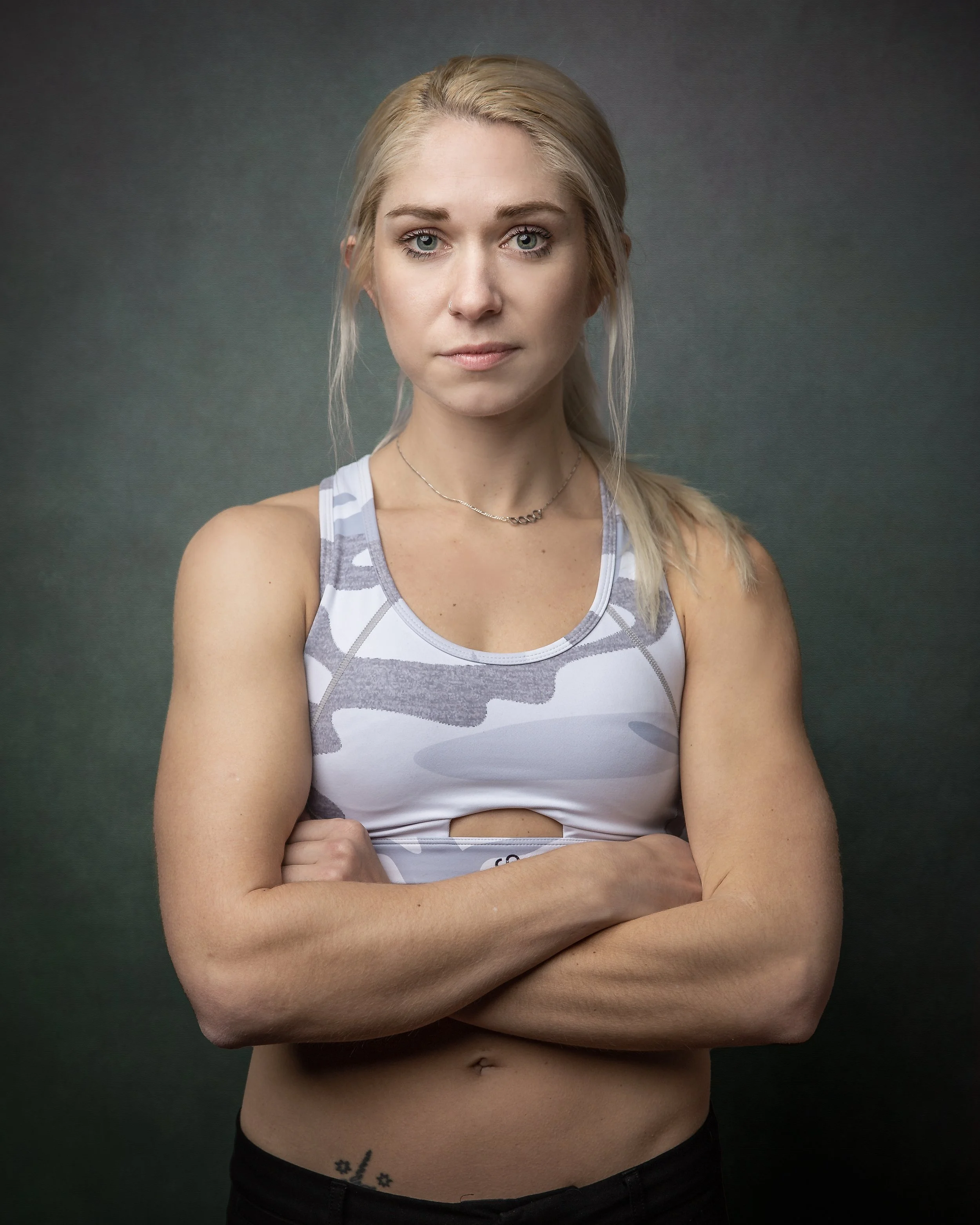 A fit woman with long blonde hair stands confidently with arms crossed, wearing a light gray camouflage sports bra against a dark, plain background. She looks directly at the camera with a serious expression.