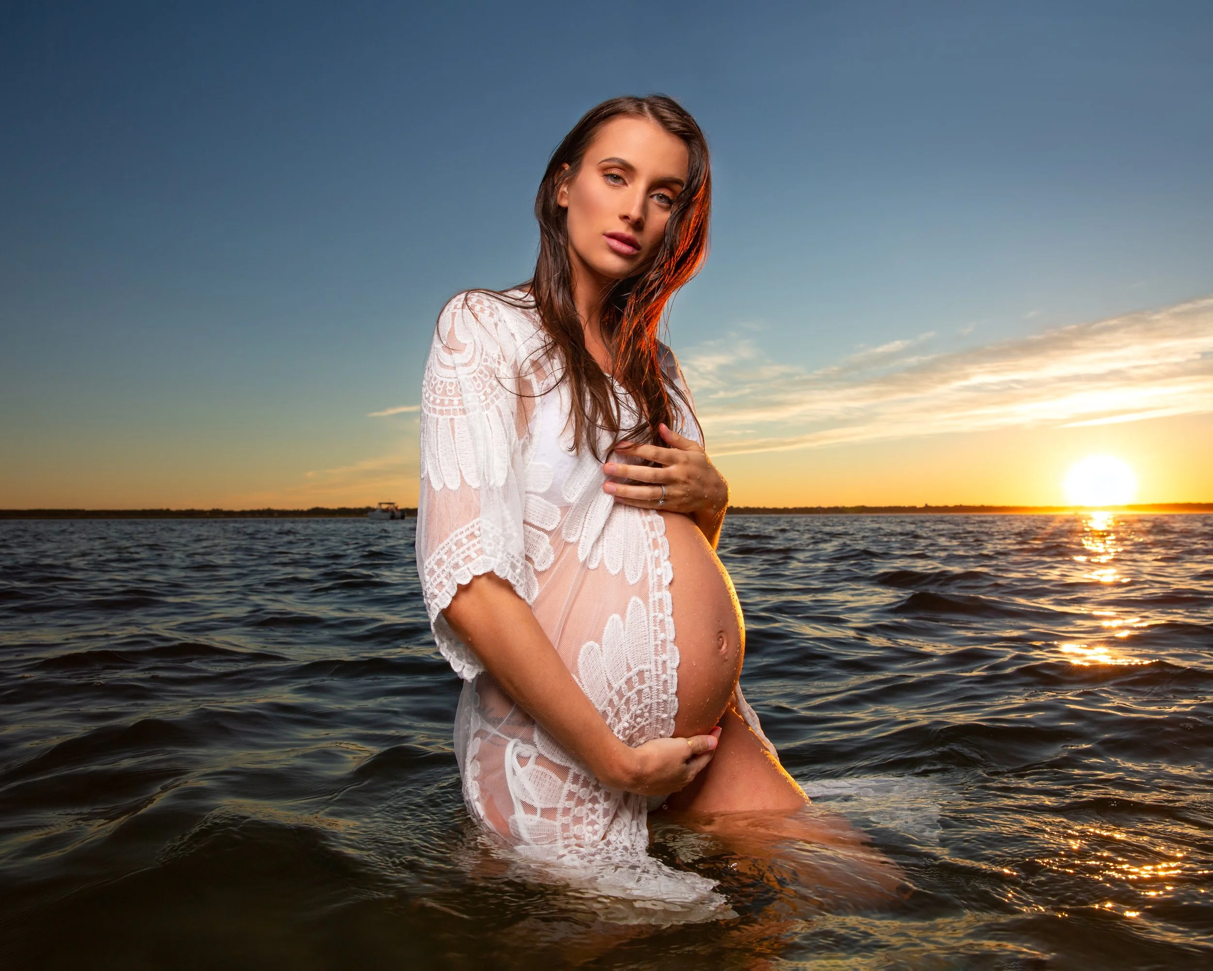 A pregnant woman in a white lace dress kneels in shallow water at sunset, gently holding her belly. The sky is clear with orange and yellow hues, and the sun is low on the horizon.